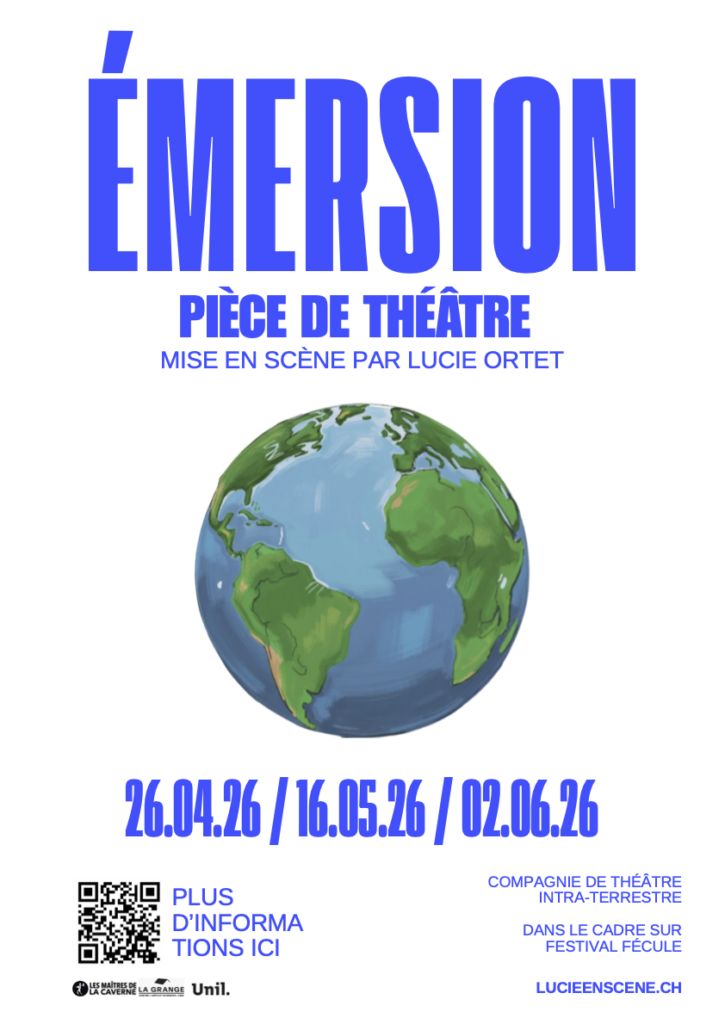 Un globe terrestre brille dans le noir. Les spectateurices sont assis.e.x.s dans l’obscurité. Tout va bien jusqu’à qu’on allume les lumières. Émersion est un spectacle qui questionne le dispositif immersif. Et si on parlait du monde à partir d’un autre point de vue ? La distance entre fiction et réalité : rompue. Les personnages se métamorphosent et les spectateurices sont pris.e.x.s au dépourvu… Qu’est devenu le monde ?